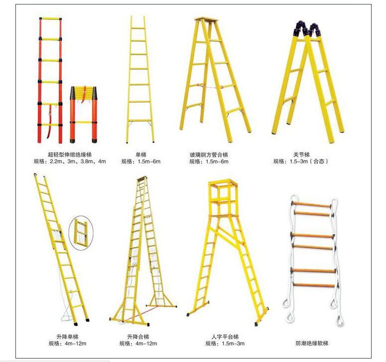 絕緣梯分為絕緣魚竿梯、絕緣人字梯、絕緣抱桿梯、絕緣懸掛梯、絕緣關節梯、絕緣升降合梯、絕緣升降單梯、絕緣升降合梯、絕緣合梯、絕緣伸縮梯等等。